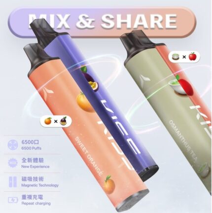 KIS5 6500口拋棄式電子煙創新磁吸雙口味設計,12款精選風味自由混搭,創造高達78種口感組合。6500口超長續航、13mL 大煙油、Type-C 快充,一支抵多支,輕鬆滿足你的風味需求與攜帶便利!
