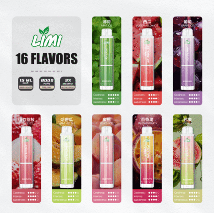【買十送一】下單備註贈送口味,未備註隨機贈送 LIMI 8000口一次性電子煙提供超大容量,適合重度使用者。內置 550mAh 電池與 15ML 煙油,提供長達 8000口 的使用體驗。可充電,使用完畢即可拋棄。
