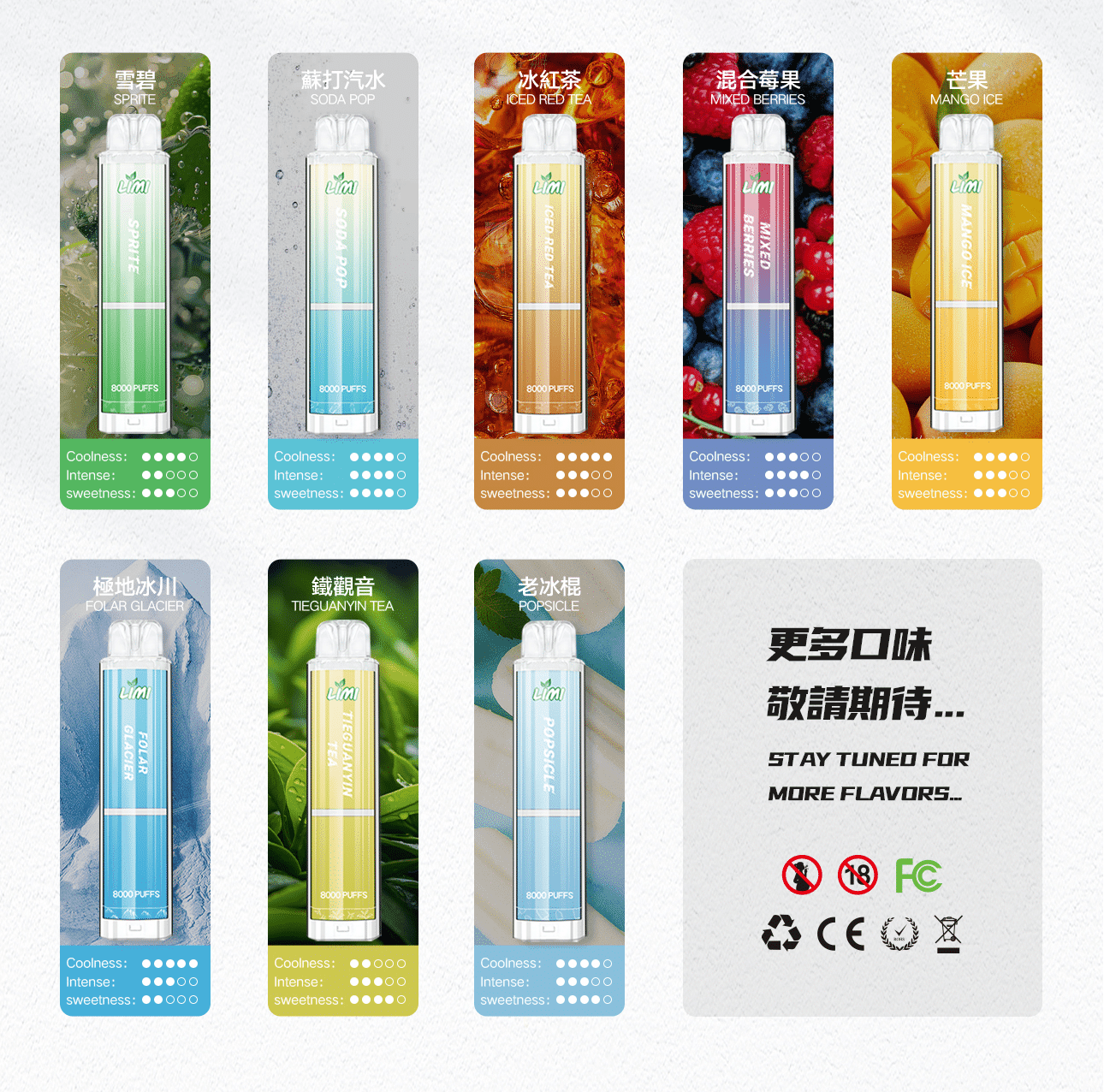 LIMI 8000口一次性電子煙提供超大容量,適合重度使用者。內置 550mAh 電池與 15ML 煙油,提供長達 8000口 的使用體驗。可充電,使用完畢即可拋棄。